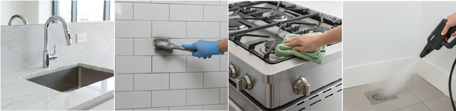 ♦ 주방 집중 청소 : 기름때와 생활오염이 가장 많이 쌓이는 주방 공간을 집중 관리. 싱크대·상판·가열기기 주변까지 깔끔하게 정리
